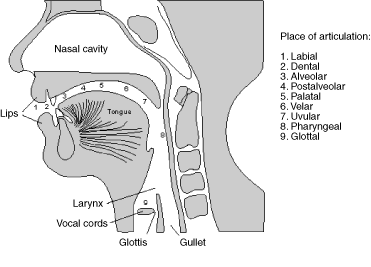 For a demonstration of what place of articulation means, consider the picture below. It shows the human throat, nose, and mouth region and indicates which places take part in the articulation process.